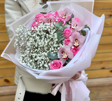 Фиолетовые розы с гипсофилой